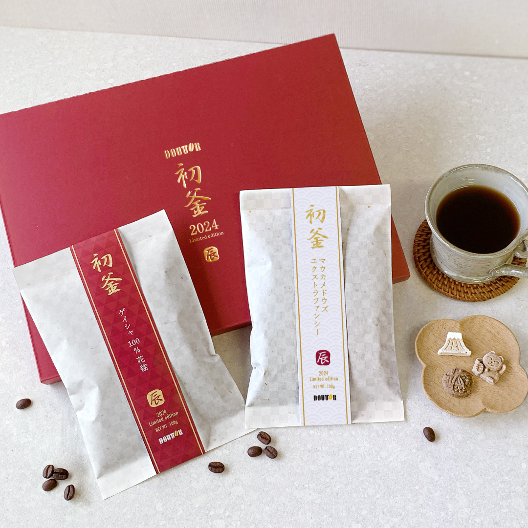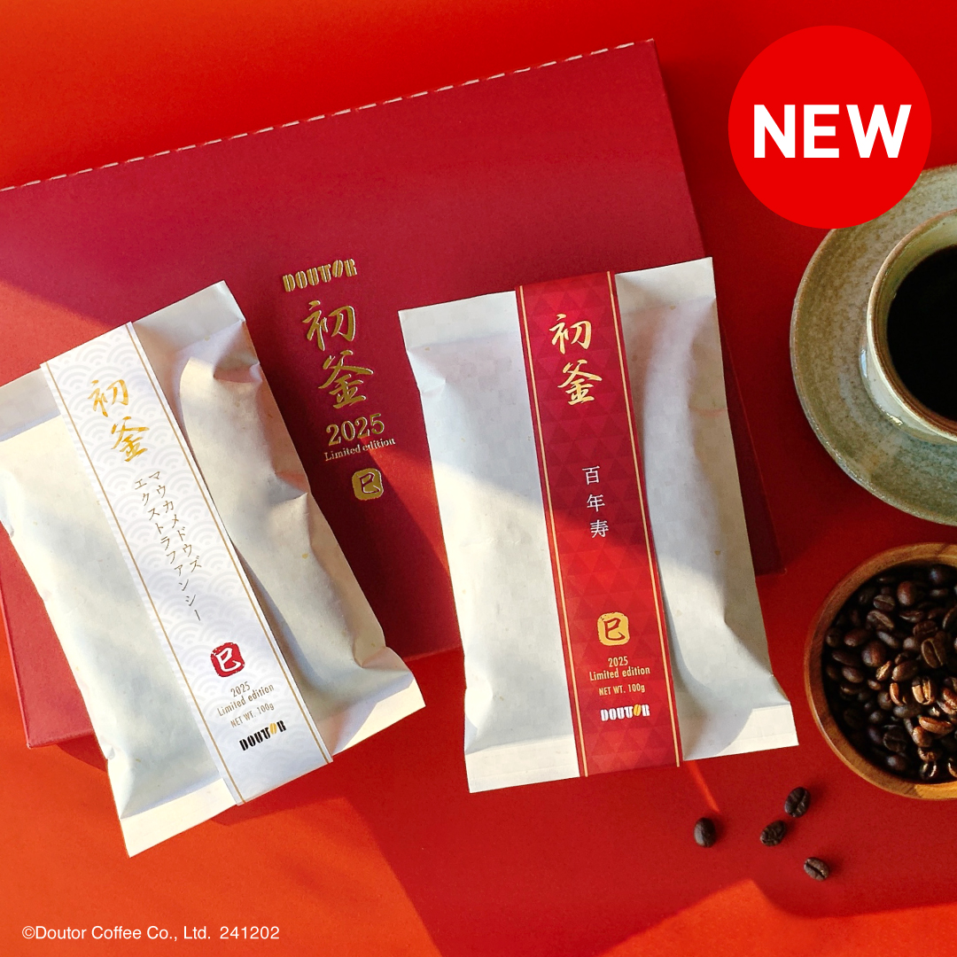 今年の「初釜」は、ドトールコーヒーの自社農園「マウカメドウズ」で栽培したハワイコナの最高等級であるハワイコナ エクストラファンシーと、まるで花束を抱えたようなフローラルで華やかな香り、爽やかな酸味と甘みをもつコロンビア産のゲイシャ、2つの特別なコーヒー豆をセットにして、焙煎したてを「初釜」としてお届けします。