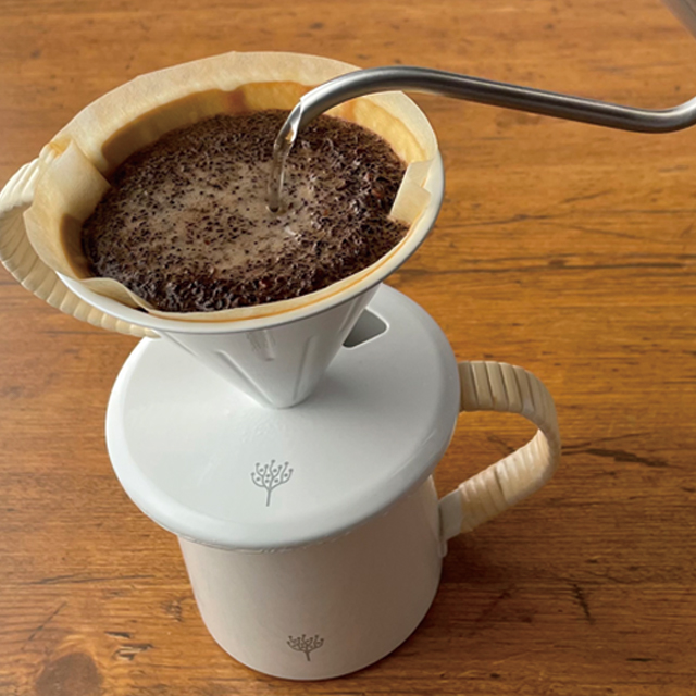 一穴円錐型タイプの琺瑯のドリッパーです。琺瑯加工が素材本来の匂い、味質が変わらない特性を持っていることから、コーヒー本来の香りと味を損なうことなく抽出できます。