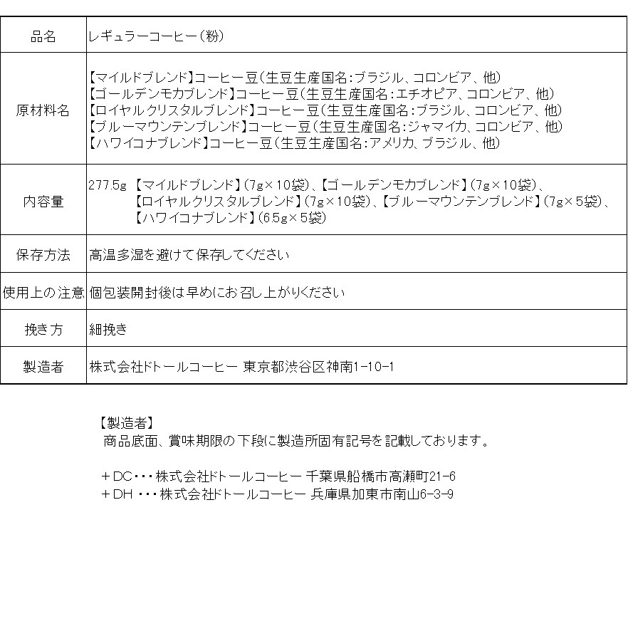 マイルドブレンド 10パック / ゴールデンモカブレンド 10パック / ロイヤルクリスタルブレンド 10パック / ハワイコナブレンド 5パック / ブルーマウンテンブレンド 5パック