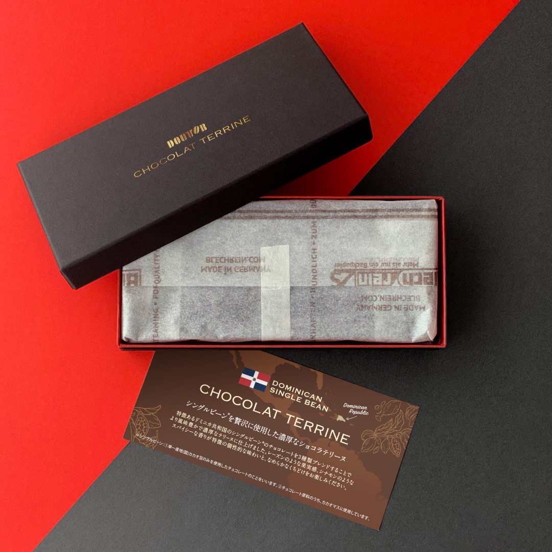 ドミニカ共和国のシングルビーン※のチョコレートを3種類ブレンドする事で、より風味豊かで濃厚なテリーヌに仕上げました。レーズンのような果実感、シナモンのようなスパイシーな香りが特徴の個性的な味わいと、なめらかなくちどけをお楽しみいただけます。